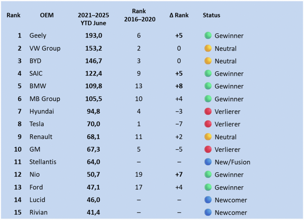 Na drugom mjestu je njemačka Volkswagen Grupa (153 indeksna boda), a slijede kineski proizvođači BYD (147 indeksnih bodova) i SAIC - s markama poput Maxus i MG - (122 indeksna boda) na trećem i četvrtom mjestu. Njemački proizvođači BMW (110 indeksnih bodova) i Mercedes-Benz (106 indeksnih bodova) zauzimaju peto i šesto mjesto.