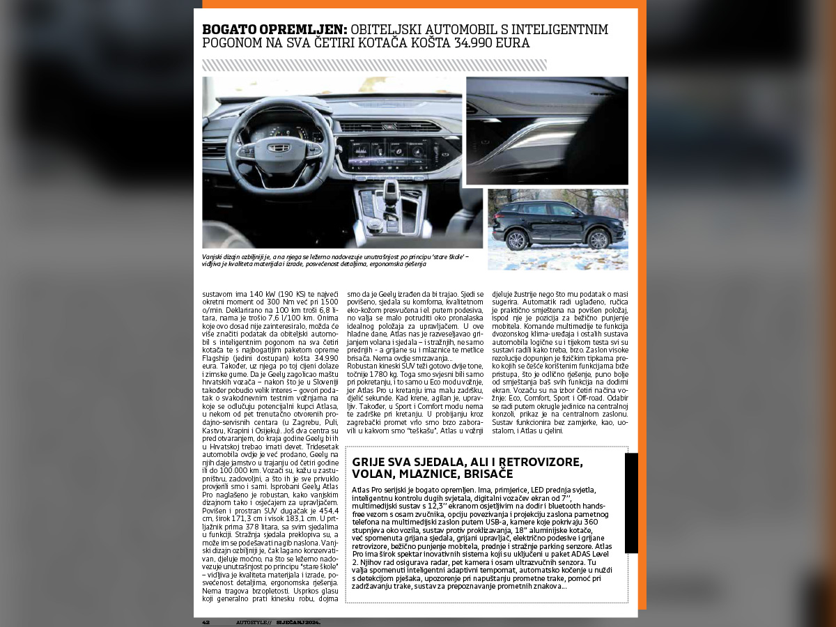 Onima koje ovo dosad nije zainteresiralo, možda će više značiti podatak da obiteljski automobil s inteligentnim pogonom na sva četiri kotača te s najbogatijim paketom opreme Flagship (jedini dostupan) košta 34.990 eura. Također, uz njega po toj cijeni dolaze i zimske gume. Da je Geely zagolicao maštu hrvatskih vozača - nakon što je u Sloveniji također pobudio velik interes - govori podatak o svakodnevnim testnim vožnjama na koje se odlučuju potencijalni kupci Atlasa, u nekom od pet trenutačno otvorenih prodajno-servisnih centara (u Zagrebu, Puli, Kastvu, Krapini i Osijeku). Još dva centra su pred otvaranjem, do kraja godine Geely bi ih u Hrvatskoj trebao imati devet. Tridesetak automobila ovdje je već prodano, Geely na njih daje jamstvo u trajanju od četiri godine ili do 100.000 km. Vozači su, kažu u zastupništvu, zadovoljni, a što ih je sve privuklo provjerili smo i sami.