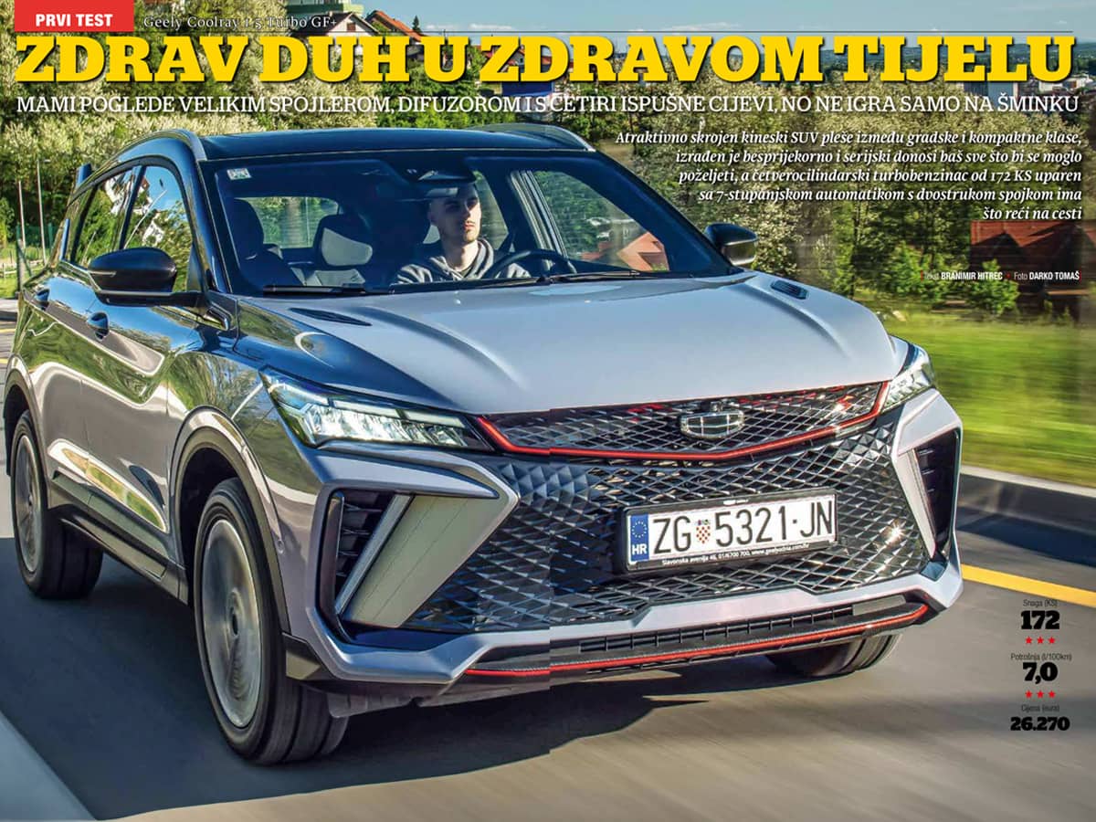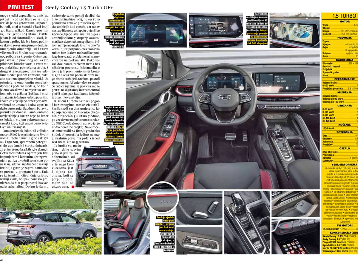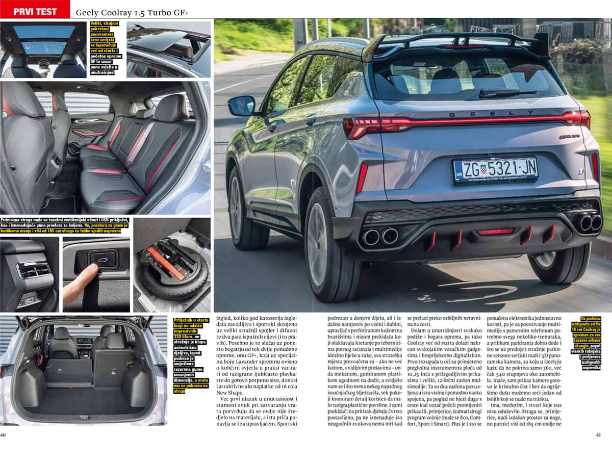 Ta su dva zaslona postavljena u istu visinu i pomodno naoko spojena, pa pogled ne bježi dugo s ceste kad vozač poželi promijeniti prikaz ili, primjerice, izabrati drugi program vožnje (nude se Eco, Comfort, Sport i Smart). Plus je i što se ponuđena elektronika jednostavno koristi, pa je za povezivanje multimedije s pametnim telefonom potrebno svega nekoliko trenutaka, a prilikom parkiranja dobro dođe i što se uz prednje i stražnje parkirne senzore serijski nudi i 3D panoramska kamera, za koju u Geelyju kažu da ne pokriva samo 360, već čak 540 stupnjeva oko automobila. Inače, sam prikaz kamere gotovo je kristalno čist i bez da ogriješimo dušu možemo reći jedan od boljih koji se nude na tržištu. Ima, međutim, i stvari koje nas nisu oduševile. Straga se, primjerice, nudi izdašan prostor za noge, no putnici viši od 185 cm ondje ne mogu sjediti uspravljeno, a niti za prtljažnik od 330 litara se ne može reći da je baš gorostasan. Usporedbe radi, onaj u Suzuki Vitari broji 375 litara, u Škodi Kamiq 400 litara, u Peugeotu 405 litara... Dakle, jedan je od skromnijih u klasi, iako mu u prilog ide što ispod podnice skriva rezervnu gumu - doduše, umanjenih dimenzija, ali i takva više znači od široko rasprostranjenog pribora za krpanje. Osim toga, prtljažnik je pravilnog oblika što pridonosi iskoristivosti, a vrata mu se, praktično, pokreću na struju. S druge strane, na prednjim se sjedalima sjedi u punom komforu, čak i ako ste iznadprosječno visoki. Uz primjerenu ergonomiju tome pridonose i podatna sjedala, od kojih je ono vozačevo i namjestivo strujom, oba su grijana (baš kao i stražnja), a uz izdašnu sjedeću površinu i bočnice koje lijepo drže tijelo u zavojima i ne umaraju kad se uputi na duže putovanje. Ugodnom boravku putnika pridonose i ambijentalno osvjetljenje s čak 72 boje na izbor te izdašan, stujom pokretan panoramski krov, koji unosi puno svjetla u unutrašnjost.