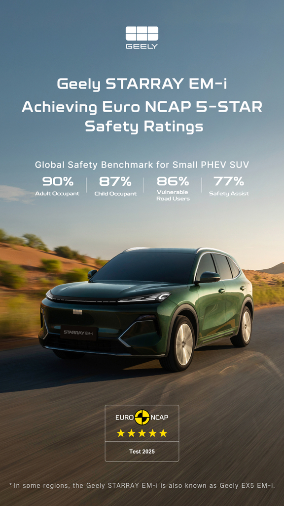 Geely Auto je nedavno objavio da je njegov prvi globalni plug-in hibridni SUV, Geely STARRAY EM-i (u nekim regijama poznat i kao Geely EX5 EM-i), postigao maksimalnih pet zvjezdica na testovima Euro NCAP-a (Europski program za ocjenjivanje novih vozila). To je već druga najviša ocjena za Geelyeva vozila na novu energiju (NEV), što potvrđuje vodeću poziciju marke u području globalnih sigurnosnih tehnologija i dugogodinju predanost Geelyja sigurnosti korisnika.
