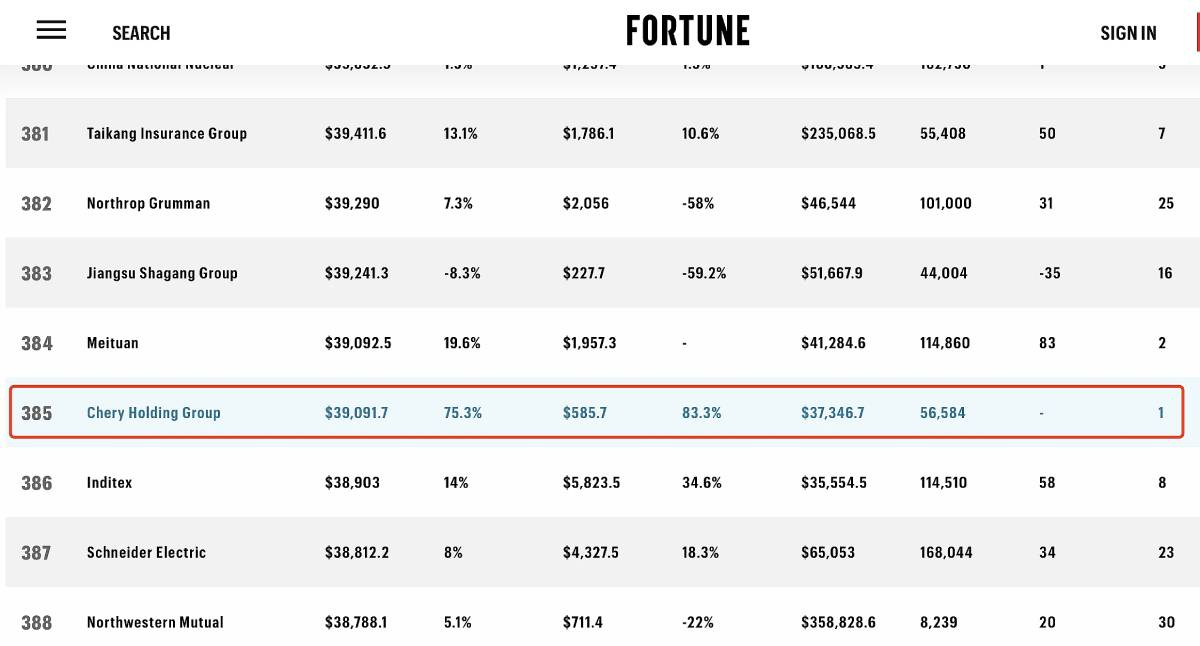 Dana 5. kolovoza, objavljena je Fortune Global 500 lista za 2024. godinu, a među najuspješnijim tvrtkama prvi se put našao i Chery, vodeći kineski nezavisni proizvođač automobila. Chery je zauzeo 385. mjesto s operativnim prihodom od 39,0917 milijardi američkih dolara, čime je dodatno potvrđena njegova globalna konkurentnost.