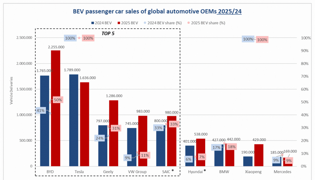 Lider po inovacijama, Geely (uključujući Volvo i Polestar), ostvario je snažan rast - prodaja BEV-a u 2025. porasla je za više od 60% na 1,29 milijuna jedinica, potaknuta širokim rasponom modela i visokom tržišnom penetracijom u Kini. Udjel BEV prodaje u Geelyju porastao je na 31%.