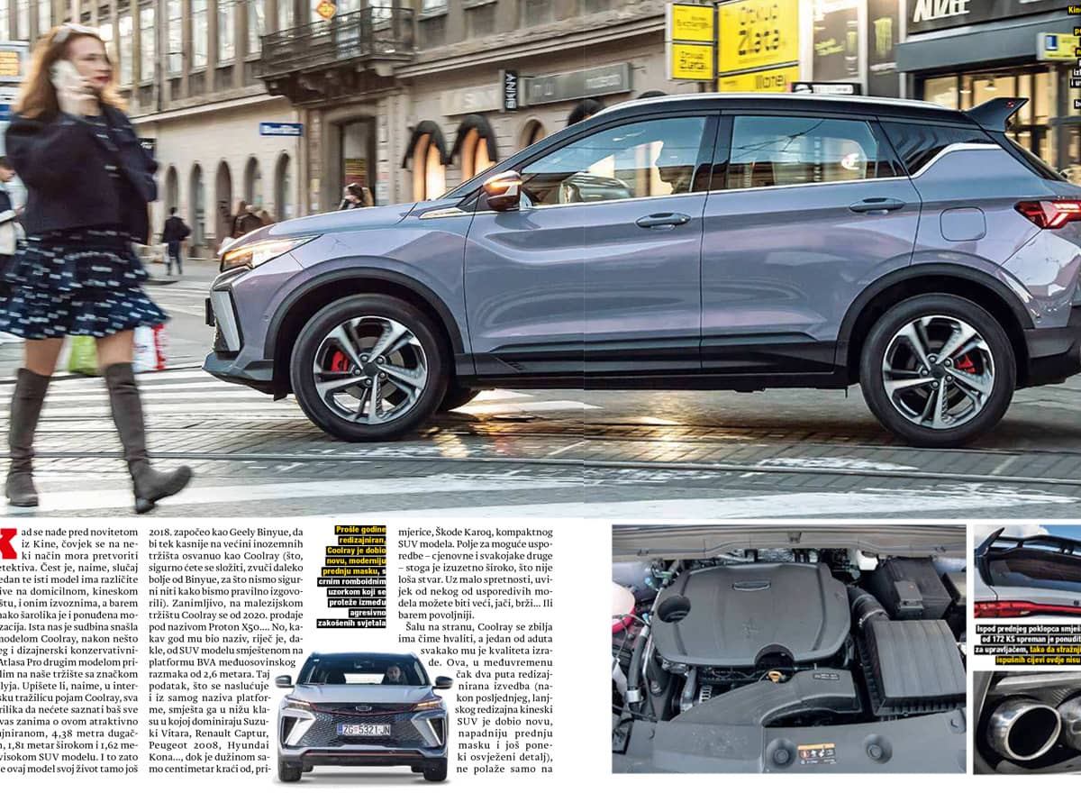 Ista nas je sudbina snašla i s modelom Coolray, nakon nešto većeg i dizajnerski konzervativnijeg Atlasa Pro drugim modelom pristiglim na naše tržište sa značkom Geelyja. Upišete li, naime, u internetsku tražilicu pojam Coolray, sva je prilika da nećete saznati baš sve što vas zanima o ovom atraktivno dizajniranom, 4,38 metra dugačkom, 1,81 metar širokom i 1,62 metra visokom SUV modelu. I to zato što je ovaj model svoj život tamo još bi tek kasnije na većini inozemnih tržišta osvanuo kao Coolray (što, sigurno ćete se složiti, zvuči daleko bolje od Binyue, za što nismo sigurni niti kako bismo pravilno izgovorili). Zanimljivo, na malezijskom tržištu Coolray se od 2020. prodaje pod nazivom Proton X50.... No, kakav god mu bio naziv, riječ je, dakle, od SUV modelu smještenom na platformu BVA međuosovinskog razmaka od 2,6 metara. Taj podatak, što se naslućuje i iz samog naziva platforme, smješta ga u nižu klasu u kojoj dominiraju Suzuki Vitara, Renault Captur, Peugeot 2008, Hyundai Kona..., dok je dužinom samo centimetar kraći od, pri-mjerice, Škode Karoq, kompaktnog SUV modela. Polje za moguće usporedbe - cjenovne i svakojake druge – stoga je izuzetno široko, što nije loša stvar. Uz malo spretnosti, uvijek od nekog od usporedivih modela možete biti veći, jači, brži... Ili barem povoljniji.