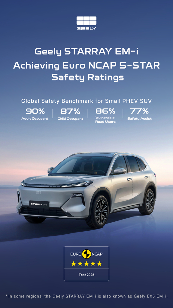 Geely Auto je nedavno objavio da je njegov prvi globalni plug-in hibridni SUV, Geely STARRAY EM-i (u nekim regijama poznat i kao Geely EX5 EM-i), postigao maksimalnih pet zvjezdica na testovima Euro NCAP-a (Europski program za ocjenjivanje novih vozila). To je već druga najviša ocjena za Geelyeva vozila na novu energiju (NEV), što potvrđuje vodeću poziciju marke u području globalnih sigurnosnih tehnologija i dugogodinju predanost Geelyja sigurnosti korisnika.